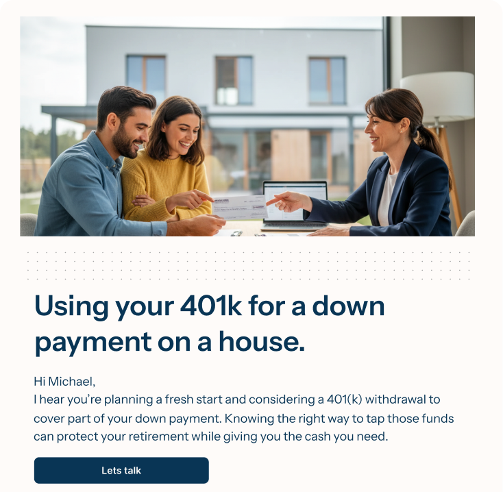 Michael mentioned using his 401k for a down payment. Felix detected the signal in real time and automatically sent personalized content.