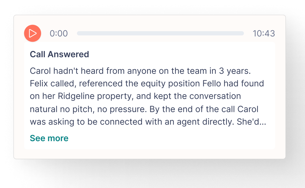 Carol hadn't been contacted in 3 years. Fello detected her equity had crossed $280K. Felix reached out the same day. Referencing her specific property and the market movement in her area.