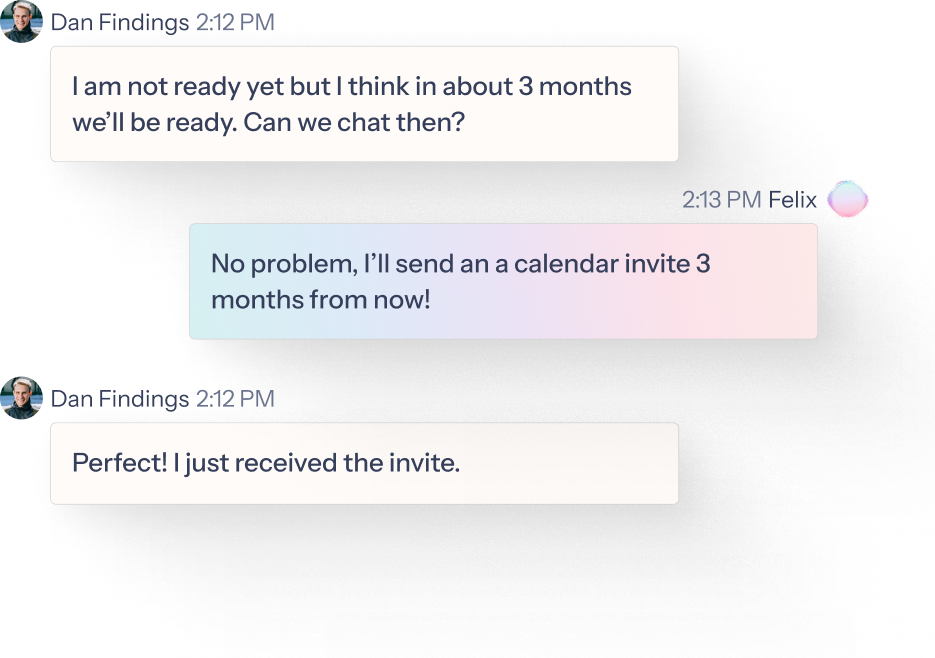 - Felix reached out same day & set follow-up 3 months later