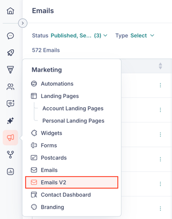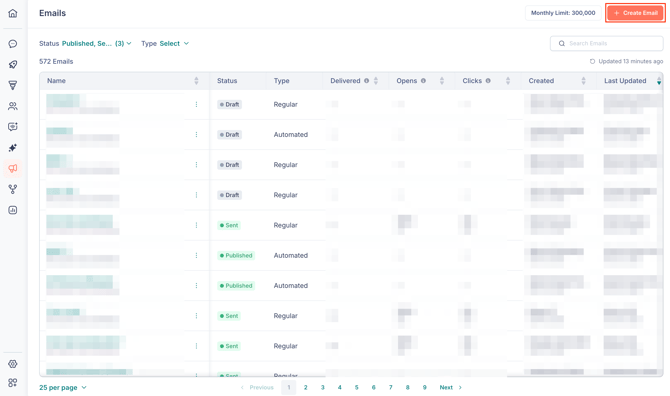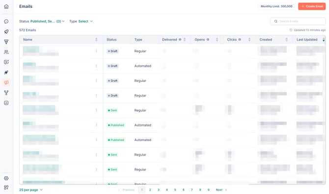 This opens the Emails page, where you can view all your emails in a list. From here, you can see each email's name, status (Draft, Sent, or Published), type (Regular or Automated), delivery and engagement metrics, and creation and last updated dates.
