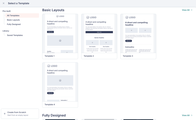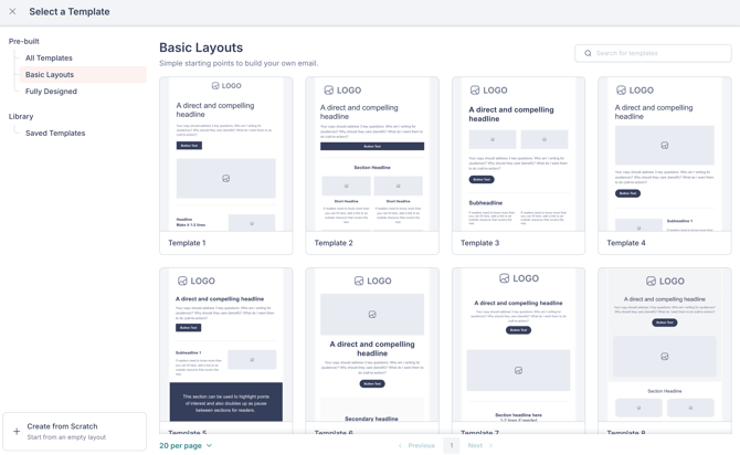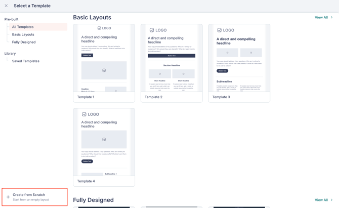 If you prefer to build your email from a blank canvas, select Create from Scratch at the bottom of the template list.