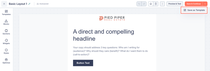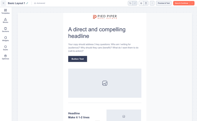 - Top bar — Displays the email name (editable), autosave status, undo/redo buttons, a save icon, desktop and mobile preview toggles, the Preview & Test button, and the Save & Continue button.