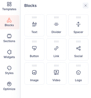 Blocks are the building elements of your email. To add a block, open the Blocks tab in the left sidebar and drag the block you want onto the canvas.