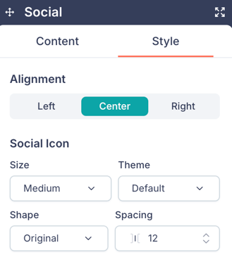 - Social Icon settings — Size (e.g., Medium), Theme (e.g., Default), Shape (e.g., Original), and Spacing.