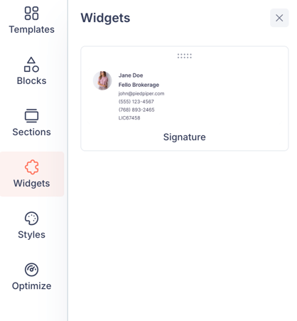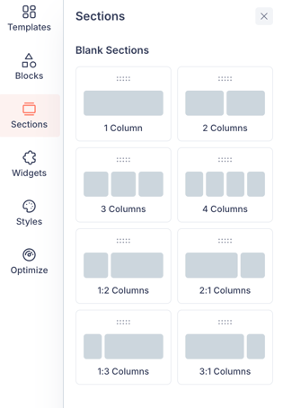 - Left sidebar — Contains six tabs for adding and configuring content: Templates, Blocks, Sections, Widgets, Styles, and Optimize.