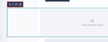 - Central canvas — The main design area where you build your email by dragging and dropping content. Each section shows "Drop content here" placeholders where you can add blocks.