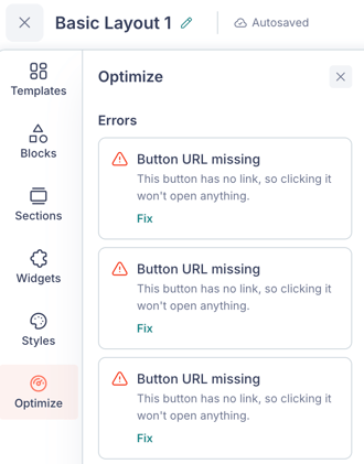 💡 Tip: Address all errors and review the suggestions before sending your email. Following these recommendations can help improve open rates and click-through rates.