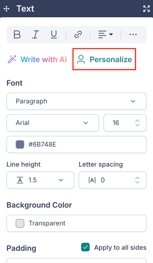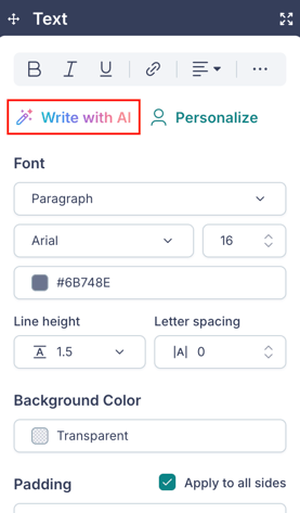 Write with AI helps you generate or refine text content using AI. It's available in the Text block, Button block, Link block, Subject Line, and Preview Text.