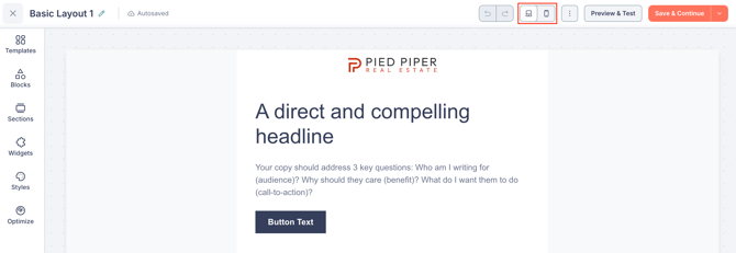 Use the desktop and mobile toggle icons in the top bar to switch between desktop and mobile views of your email directly in the builder.