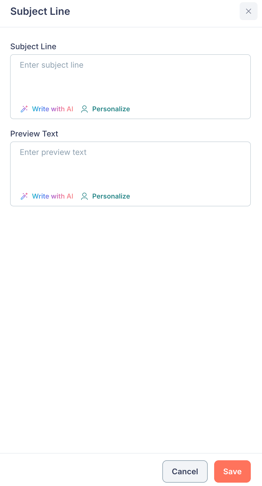 - Preview Text — Enter the preview text that appears alongside the subject line in recipients' inboxes. This also supports Write with AI and Personalize.