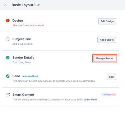 Click Manage Sender to open the Sender Details panel.