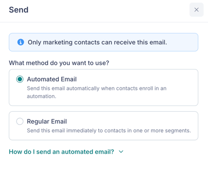 - Automated Email — Use this email within an automation or workflow. It will be sent automatically when contacts enroll. After selecting this option, you can link the email to an automation or workflow from within those features.