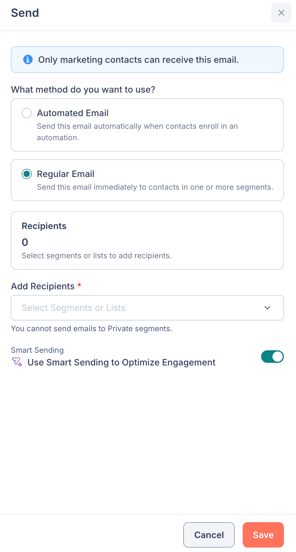 🗒️ Note: You cannot send emails to Private segments. At least one segment or list is required to send a Regular Email.