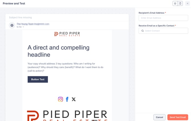 Before sending, you can preview your email across devices and send a test version to verify how it looks in an actual inbox.