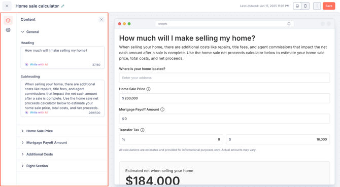 Note: Some widget templates, like Home Sale Calculator feature unique customization options such as additional costs. You can enable/disable these fields as required. - Click Save.