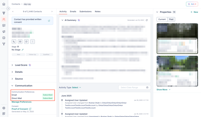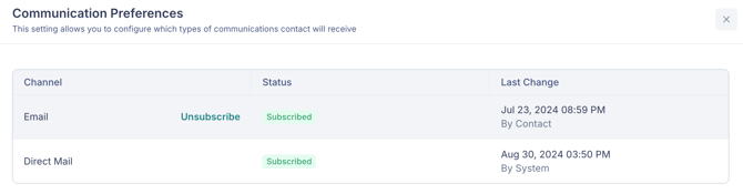 Learn how to view whether your contacts or leads are subscribed to your marketing communications, and how to change their communication preferences.