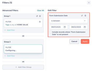 💡 Tip: To view home value leads that were generated on a particular date or period, you can apply the Form Submission Date filter with the condition set as "is between", and then select a date range.