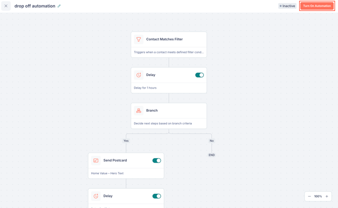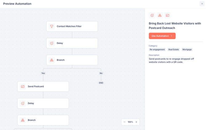 Set It and Forget It: Once activated, the automation takes over the tedious task of follow-ups. Pre-designed, yet customizable, this automation sends out direct mail postcards to reconnect with your visitors, providing a personal touch that digital communications sometimes lack.