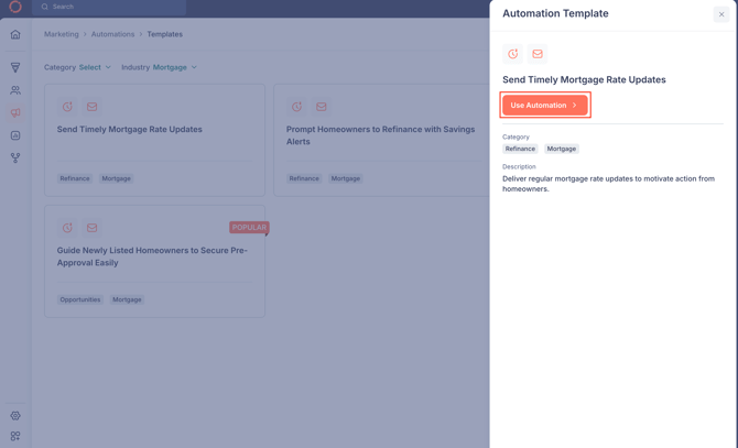 Prompt Homeowners to Refinance with Savings Alerts | This automation sends a targeted email series to homeowners with higher mortgage interest rates, showcasing the benefits of refinancing. |